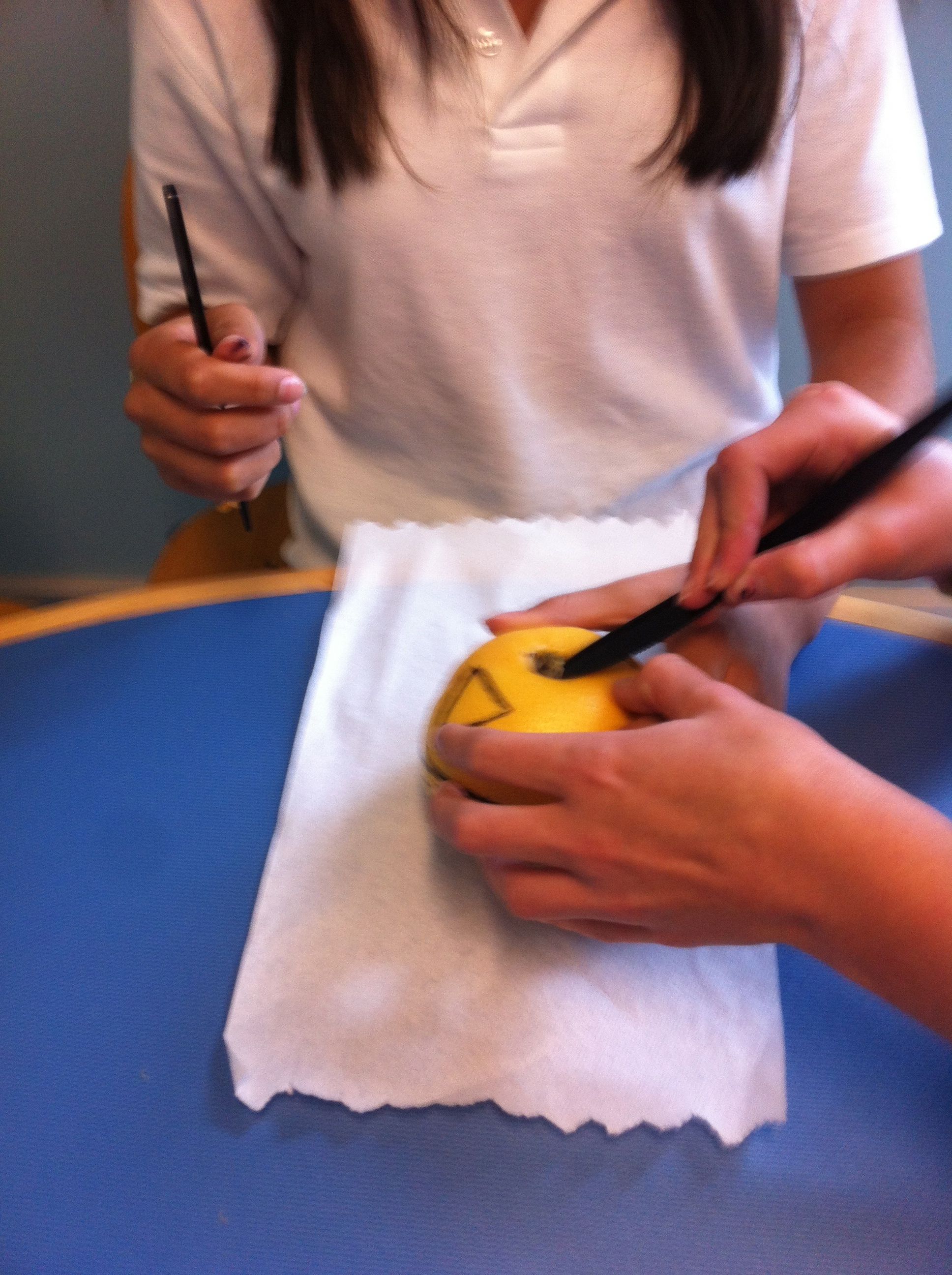 The first challenge turned out to be the grapefruits themselves. I had completely forgotten about the weather issues this summer that had impacted the grapefruits crops. It was only as I was standing in the market at 7:00 AM, seeing no grapefruits in sight, that I remembered. Luckily, with some searching, I found a small display of very expensive fruit. Given the fact that this was my lesson and I really wanted to try it, I bought half the number that I had originally planned on, deciding that the students could work in pairs rather than independently. Then I collected the necessary plastic knives and permanent markers, and I was ready to go.