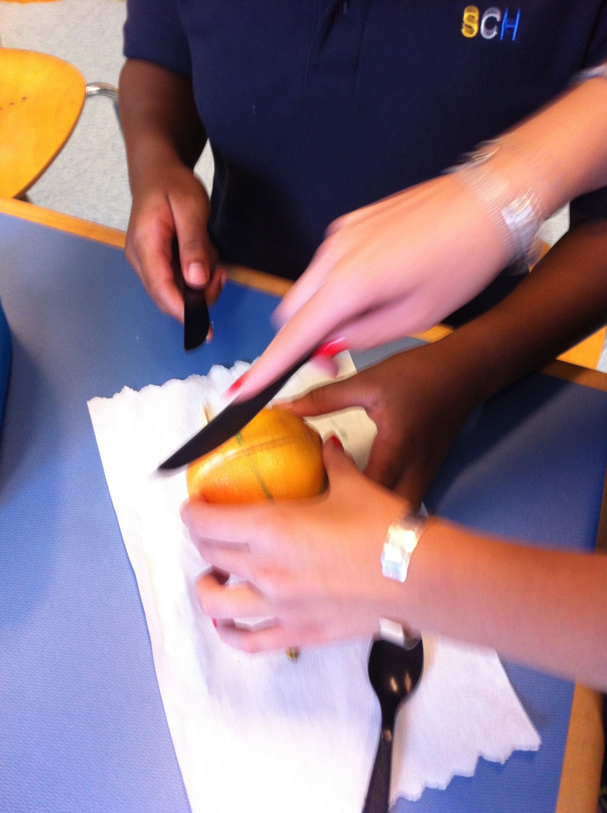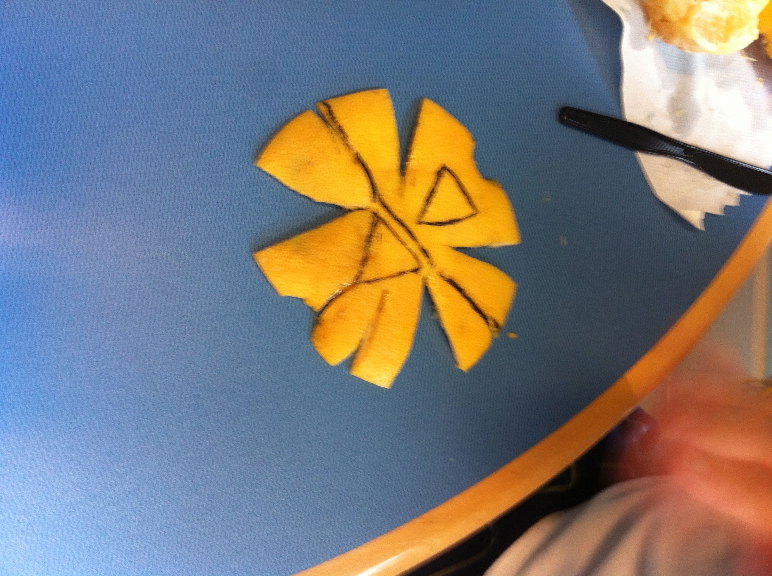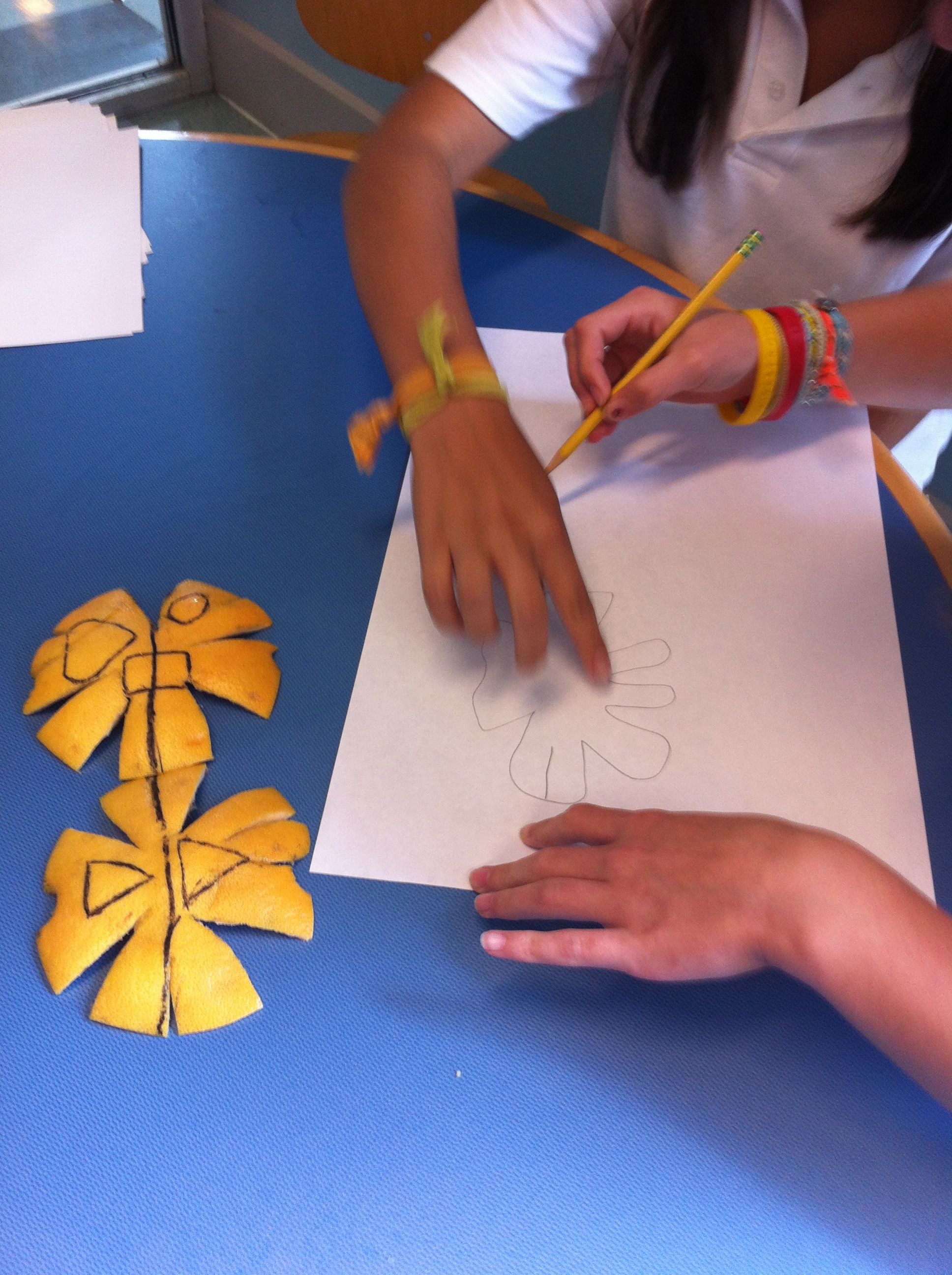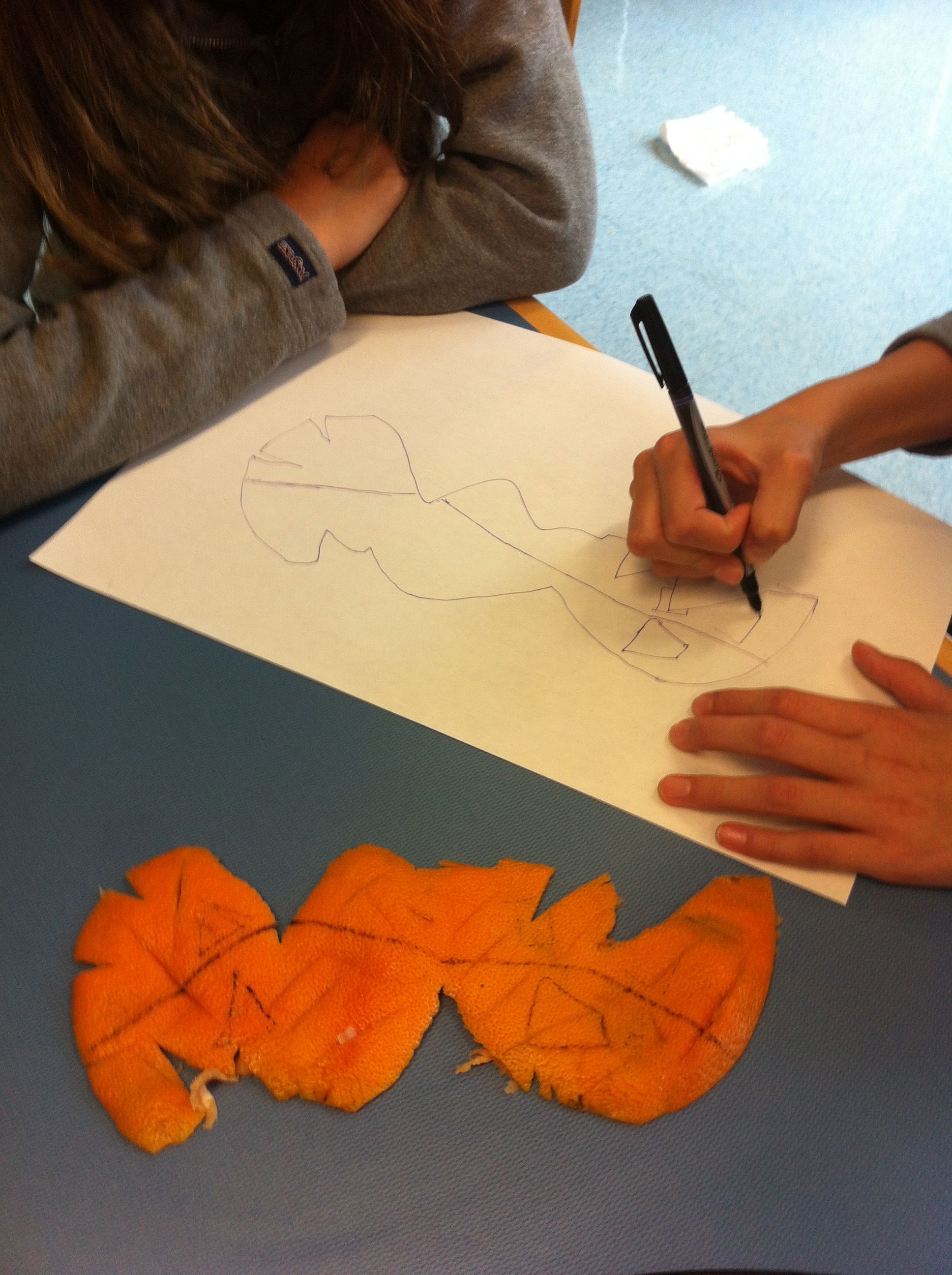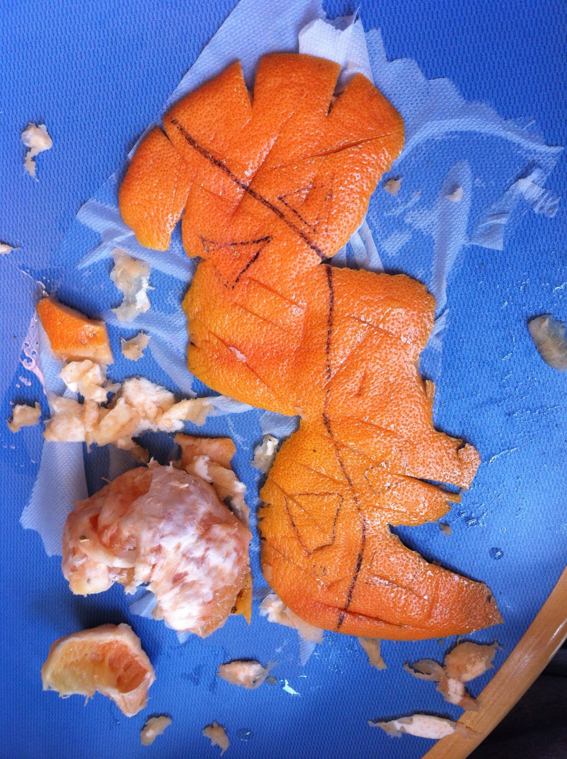 It was messy and wonderfully fun, as they tried to figure out how to create a map that made sense. Some of them simply peeled on small pieces and the placed them close together, usually with some unknown parts left to cause confusion. Others cut the grapefruit in half and worked on figuring out a strategy to get it to lie flat on the table.